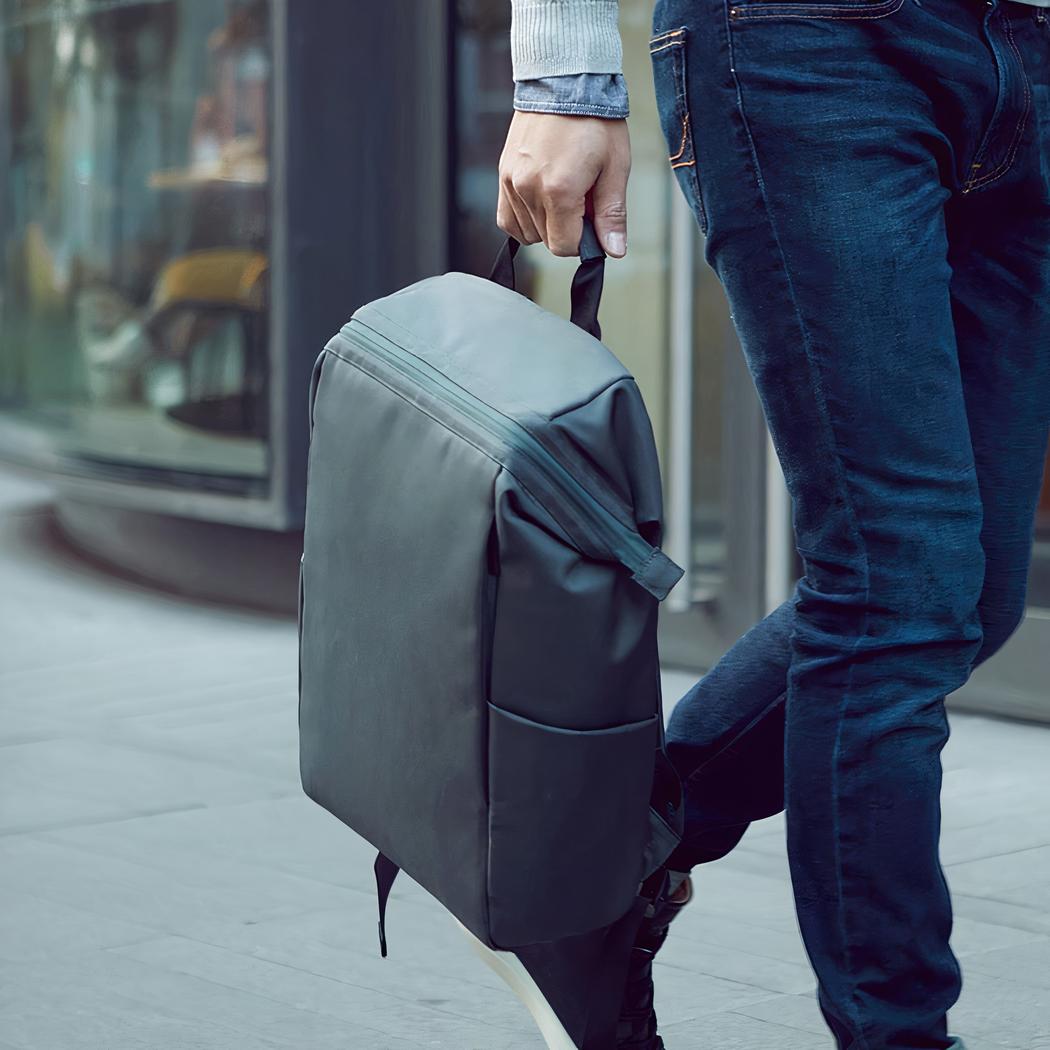Strukturiert und minimalistisch ist er ein idealer Begleiter für Stadtbewohner, die einen modernen Look und optimale Funktionalität suchen. Dank des Riemens auf der Rückseite können Sie ihn unterwegs über den Griff Ihres Koffers ziehen. Sein ergonomischer Griff ist praktisch, um ihn wie eine Tasche zu tragen.