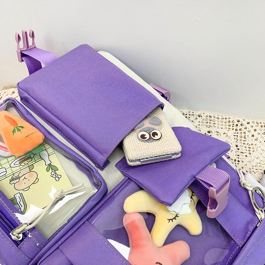 Die vier Fächer sind so konzipiert, dass sie optimalen Stauraum und eine optimale Organisation bieten. Die Außentaschen eignen sich perfekt für persönliche Gegenstände wie Geldbörse, Telefon und Schlüssel. Um seinen Look zu vervollständigen, wird dieser Rucksack mit einem Plüsch-Schlüsselanhänger geliefert, der ihm einen zusätzlichen Hauch von Stil und Phantasie verleiht. Mit diesem trendigen und praktischen Rucksack werden Sie garantiert überall für Aufsehen sorgen.